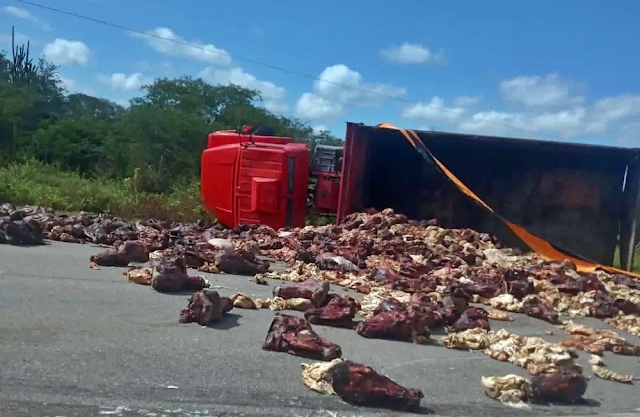 Um caminhão transportando cabeças de boi ou cavalo tombou na BR-110, em Ibimirim, no Sertão de Pernambuco. O caso aconteceu na última terça-feira (22), mas só foi divulgado nesta quinta (24).